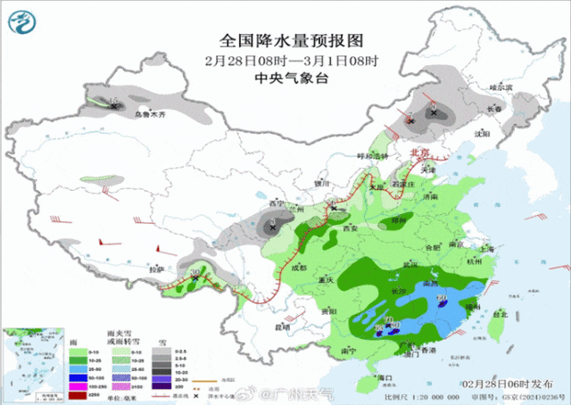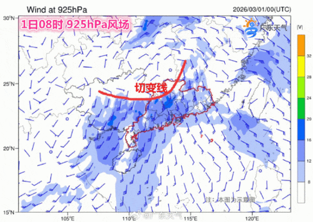 ● 预计1日,暖湿气流推动切变线到粤北,2日,北部的冷空气又将切变南压到广东中部,所以28日到3月2日,天气形势对广东中北部的降雨都比较有利。